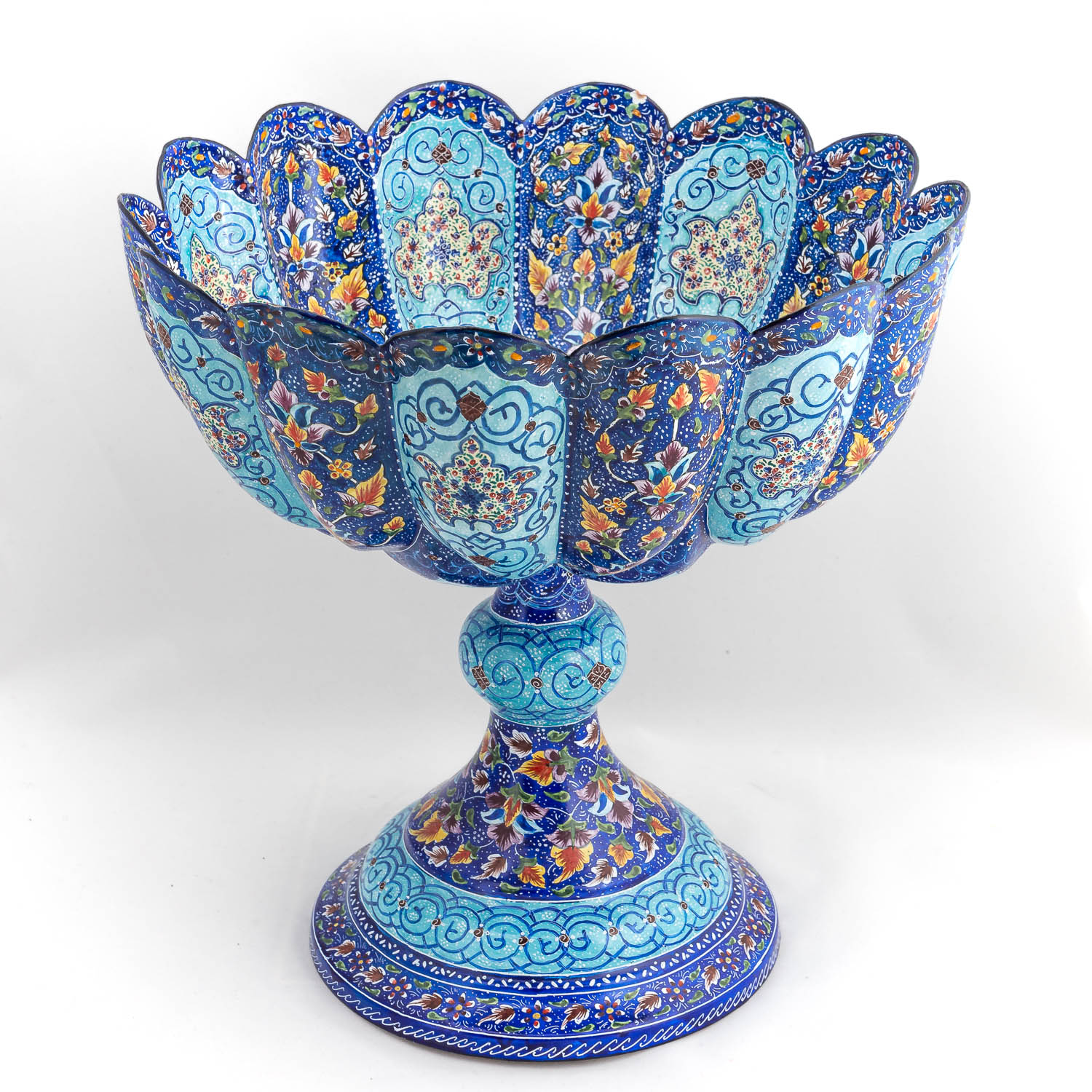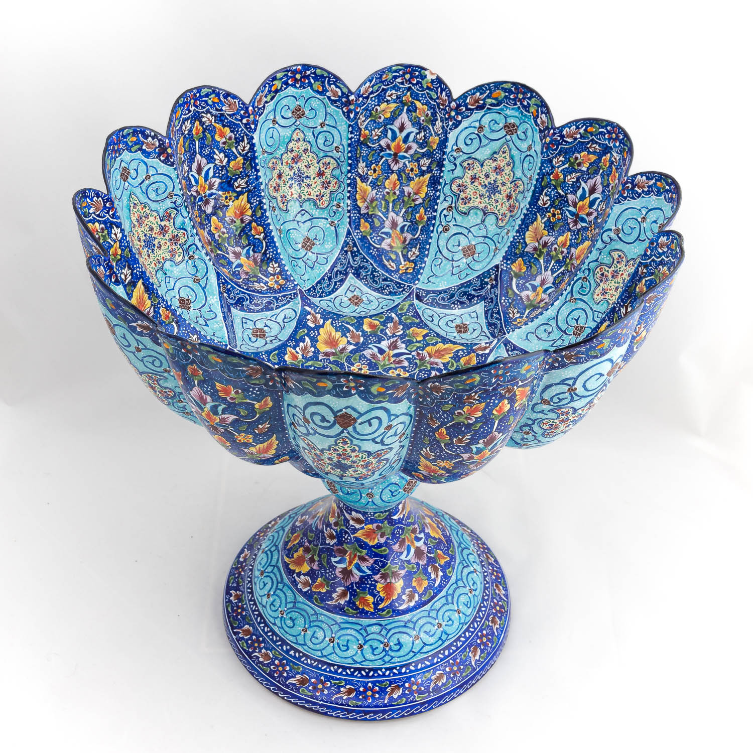 Enameling in Isfahan is very popular. The Artists create various design on the glazing surface which is covered by lustre enamel. At first the master of coppersmith makes the object according to the design has been prepared and then the master of enamelling covers the object with the white glaze. The coverage of enameling may be repeated up to 4 times and every time the object is placed in the oven with 700 centigrade to prove the colour of enamelling